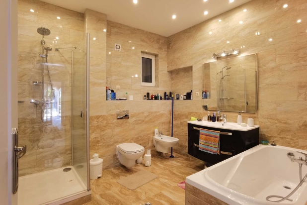 A képen, a földszinti fürdőszoba (kád,- mosdó,- zuhanyozó,- WC,- Bidé) látható.